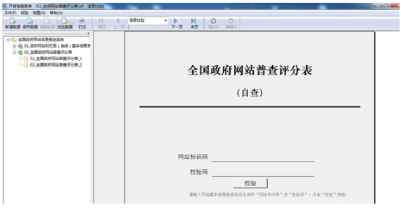 填報單位打開客戶端軟件,選取“全國政府網(wǎng)站普查評分表”并新建數(shù)據(jù),首先輸入“網(wǎng)站標(biāo)識碼”和“校驗碼”,通過驗證后,填寫該網(wǎng)站的自查評分信息并保存。