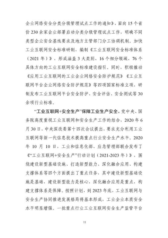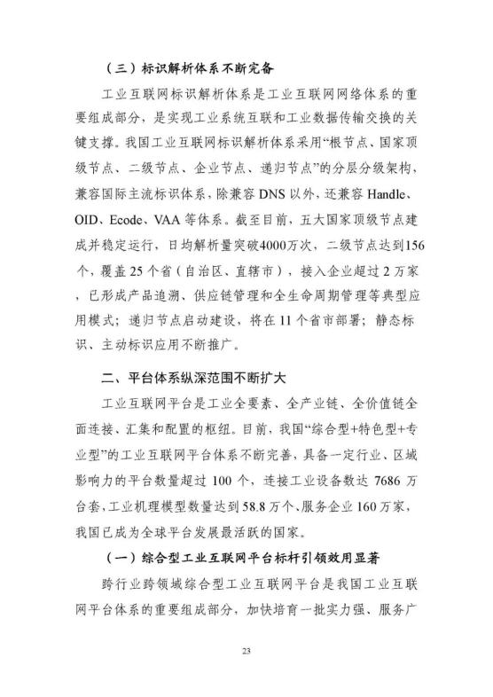 從無到有,四大體系建設(shè)取得突破性進展。在市場推動和政策指引下,網(wǎng)絡體系建設(shè)邁上了新臺階,高質(zhì)量的外網(wǎng)建設(shè)覆蓋全國300多個地市,連接工業(yè)企業(yè)18萬家。TSN、5G等新型網(wǎng)絡技術(shù)推動企業(yè)內(nèi)網(wǎng)改造力度不斷加大。工業(yè)互聯(lián)網(wǎng)標識解析實現(xiàn)了從0到1的跨越,五大頂級節(jié)點建成并穩(wěn)定運行,標識注冊量突破400億。平臺體系建設(shè)取得積極進展,15個雙跨平臺引領(lǐng)示范作用日益顯著,具有一定行業(yè)區(qū)域影響力的工業(yè)互聯(lián)網(wǎng)平臺超過100家,服務企業(yè)超160萬家,同時平臺連接的重要工業(yè)設(shè)備已經(jīng)超過7600萬臺/套。數(shù)據(jù)體系建設(shè)取得了積極成效,從規(guī)劃建設(shè)到落地推動,全國一盤棋的國家工業(yè)互聯(lián)網(wǎng)大數(shù)據(jù)體系正在匯聚成形,大數(shù)據(jù)中心體系覆蓋企業(yè)已經(jīng)超700萬家。安全體系建設(shè)快速推進,威脅監(jiān)測和信息通報的處置不斷強化,企業(yè)安全的主體責任意識逐步增強,國家、省、企業(yè)三級聯(lián)動的技術(shù)監(jiān)測體系在全國推廣。