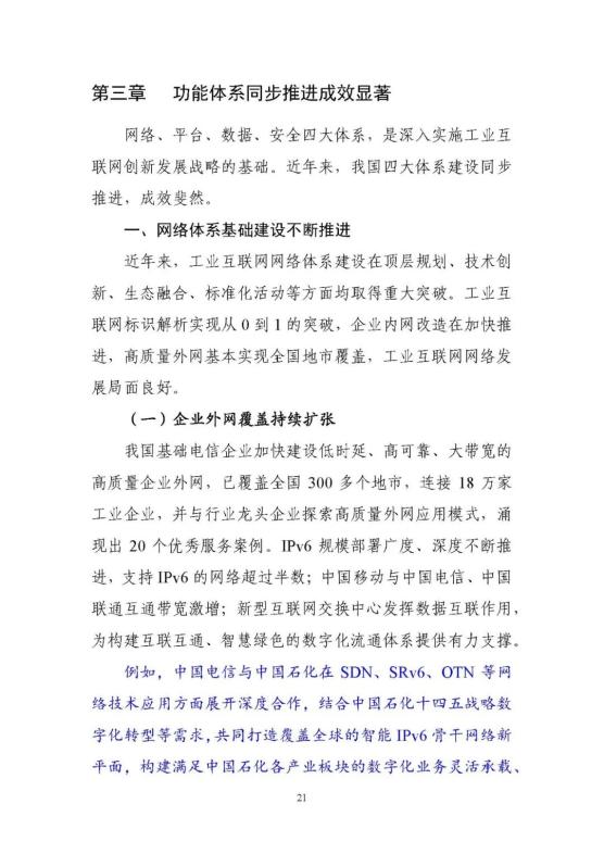 10月18日,在2021全球工業(yè)互聯(lián)網(wǎng)大會上,中國工業(yè)互聯(lián)網(wǎng)研究院院長魯春叢發(fā)布了《工業(yè)互聯(lián)網(wǎng)創(chuàng)新發(fā)展成效報告(20182021年)》(以下簡稱《報告》)?!秷蟾妗分赋觯怨I(yè)互聯(lián)網(wǎng)創(chuàng)新發(fā)展戰(zhàn)略實施以來,我國工業(yè)互聯(lián)網(wǎng)創(chuàng)新發(fā)展戰(zhàn)略穩(wěn)步推進,三年行動計劃全部完成,部分重點任務和工程超出預期,網(wǎng)絡基礎(chǔ)、平臺中樞、數(shù)據(jù)要素、安全保障作用進一步顯現(xiàn)。