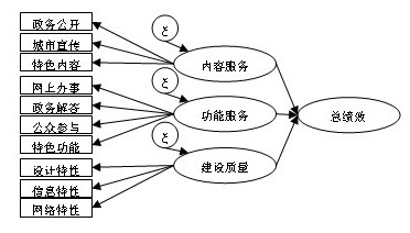 前試的主要目的不在于給出對網(wǎng)站的測評結(jié)論,而是驗證后續(xù)將要使用的評估指標(biāo)體系的維度劃分是否具有結(jié)構(gòu)性依據(jù)。這是進(jìn)行測評非常有必要。由于上一期我們提到的政府門戶績效架構(gòu)(GPPA)是一個完備的績效管理模型,根據(jù)其中從服務(wù)參考模型(SRM)的基本模塊要求,我們篩選了最為關(guān)鍵的10個方面作為擬篩選的指標(biāo)。調(diào)查對象為曾使用過當(dāng)?shù)卣T戶網(wǎng)站浙江省普通市民,共發(fā)放問卷500份,回收310份,其中有效問卷263份。探索性因子分析經(jīng)過最大方差旋轉(zhuǎn)后,提取 3個主因子,共解釋總方差的67。296%; AMOS5。0軟件進(jìn)一步通過驗證性因素分析確定模型對實際數(shù)據(jù)的擬合程度,χ2/df的值均小于5,擬合良好性指標(biāo)、調(diào)整擬合良好性指標(biāo)、常規(guī)擬合指標(biāo)、比較擬合指標(biāo)值均在0。85 %以上,RMSEA的置信區(qū)間上限在0。08以下,模型的擬合效果比較好。其結(jié)構(gòu)關(guān)系如下圖所示: