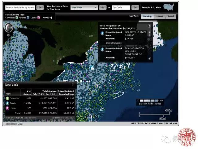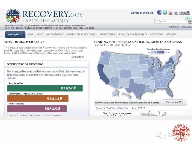 下面舉幾個(gè)例子,美國(guó)最早通過(guò)《信息自由法》來(lái)推動(dòng)信息公開,第一張USAspeding.gov是關(guān)于財(cái)政數(shù)據(jù)的公開,第二張recovery.gov是美國(guó)金融危機(jī)后七千億美元救市計(jì)劃的公開,你可以看到加州和紐約州投的錢比較多,點(diǎn)開地圖上的每一個(gè)點(diǎn),會(huì)告訴你這個(gè)地方多少錢,給到哪些機(jī)構(gòu),已經(jīng)花了多少錢,創(chuàng)造了多少工作機(jī)會(huì)等等。