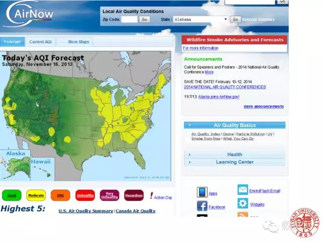 下面這個(gè)是關(guān)于空氣質(zhì)量數(shù)據(jù)的公開,你可以看到全美實(shí)時(shí)的空氣質(zhì)量情況,綠色的空氣質(zhì)量比較好,黃色的有一點(diǎn)問(wèn)題,紅色的就是有毒了。中國(guó)近些年北京上海也開展了類似的環(huán)境信息公開工作。