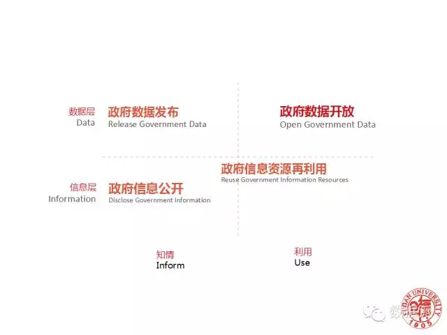 在這張表上,橫向是從知情到利用,縱向是從信息層到數(shù)據(jù)層。開放政府?dāng)?shù)據(jù)在右上角,要開放到數(shù)據(jù)層,并且保證社會(huì)對(duì)數(shù)據(jù)的利用。政府信息公開是為了保障知情權(quán),開放的是信息層。一些政府網(wǎng)站上也發(fā)布了一些數(shù)據(jù),但這就像政府在大門上貼出一張告示,說(shuō)這就是政府的數(shù)據(jù)分析結(jié)果,而政府?dāng)?shù)據(jù)開放是政府打開一個(gè)門,說(shuō)這里面的數(shù)據(jù),你們可以拿去用。過(guò)去還提過(guò)政府信息資源再利用,這和開放數(shù)據(jù)的差別是數(shù)據(jù)資源只給自己指定的公司用,但這可能涉及到數(shù)據(jù)資源權(quán)利尋租的問(wèn)題。開放數(shù)據(jù)應(yīng)該是如果你把數(shù)據(jù)給了A,就也可以給B,只要B也滿足了基本條件。