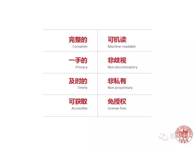 真正的開放數(shù)據(jù)要滿足以上這些標(biāo)準(zhǔn)。數(shù)據(jù)是完整的、原始的、一手的、及時(shí)的,可獲取的,有一個(gè)平臺(tái)可以讓我下載,而不是我私下里找你要,例如DATA.GOV這樣的平臺(tái)。開放數(shù)據(jù)是非歧視、非私有的,產(chǎn)權(quán)上來(lái)說(shuō)這些數(shù)據(jù)屬于公共資源,并不屬于某個(gè)政府部門,而是屬于社會(huì)的公共資源。免授權(quán),獲取過(guò)程中不再需要填一系列表格協(xié)議,就可以到網(wǎng)上下載,美國(guó)政府開放的數(shù)據(jù)我們中國(guó)人也可以去下載。