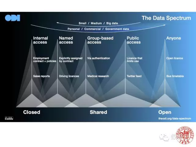 在跟英國(guó)開放數(shù)據(jù)研究院的交流中他們也提到,開放與封閉數(shù)據(jù)并不是非一即零的關(guān)系,中間有一個(gè)過(guò)渡階段,從完全封閉到完全開放中間有一個(gè)過(guò)渡階段,有些是有限度的開放,有一些是授權(quán)的開放。