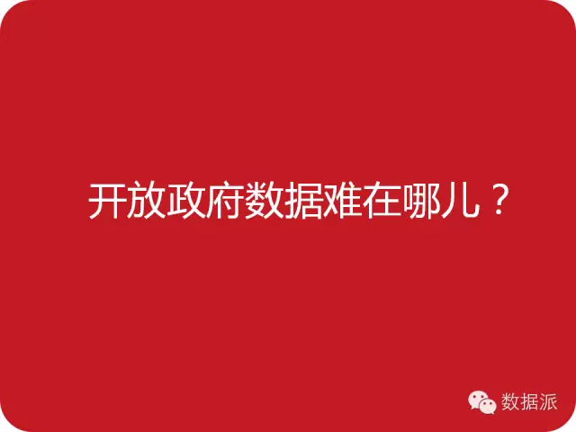 那么開放數(shù)據(jù)難在哪里?第一,數(shù)據(jù)在哪里?有些政府部門對(duì)自己有什么樣的數(shù)據(jù)資源并不完全了解,所以先要把清單整理出來(lái)。有時(shí)候你問(wèn)他要數(shù)據(jù),他說(shuō)我沒有,其實(shí)他是不知道他有,因?yàn)槊總€(gè)部門都是一條線,這個(gè)條線不知道哪條線有什么數(shù)據(jù)。