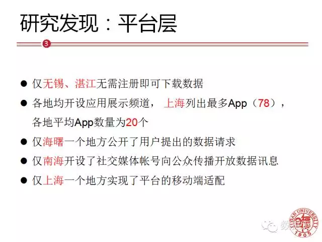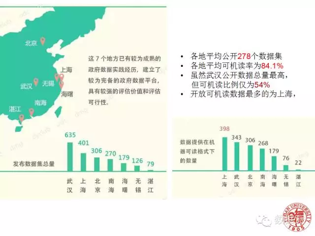 評(píng)估包括數(shù)據(jù)層和平臺(tái)層。各地平均公開了278個(gè)數(shù)據(jù)集。數(shù)據(jù)總量上看武漢是全國(guó)第一,但是武漢可機(jī)讀的數(shù)據(jù)只有一半,另外一半基本是PDF格式,不利于社會(huì)對(duì)數(shù)據(jù)的利用,不是真正的數(shù)據(jù)開放。