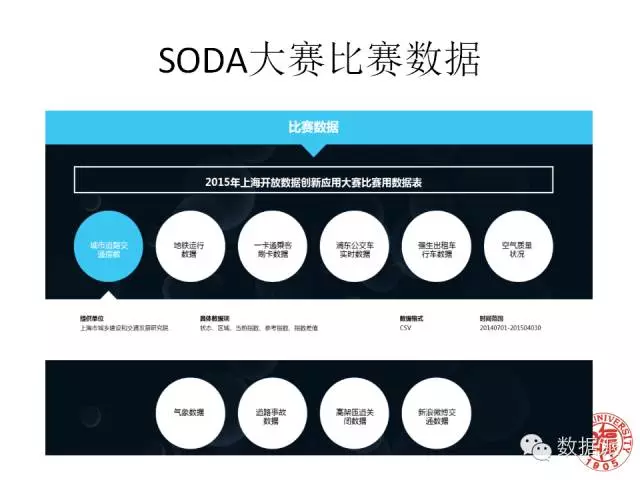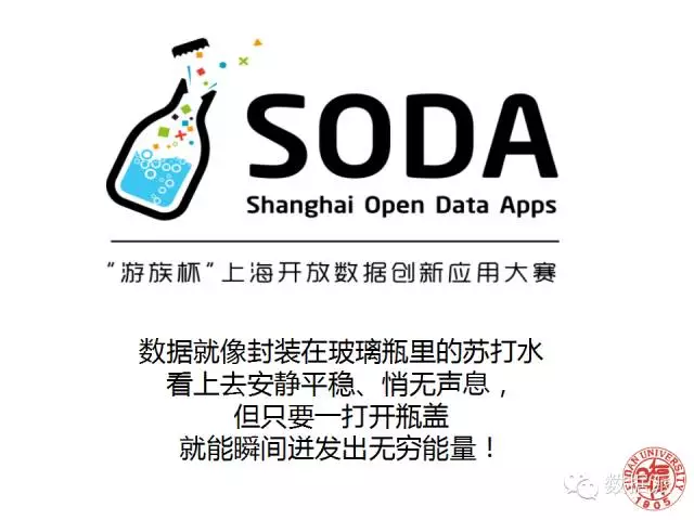 今年上海經(jīng)信委協(xié)調(diào)交通委,一共開放了1TB的數(shù)據(jù),也組織了一個(gè)大賽,名稱很好玩,叫SODA大賽。當(dāng)我們把Shanghai Open Data Apps這幾個(gè)詞的首字母放在一起的時(shí)候,正好就是SODA,就是蘇打水的意思。這正符合開放數(shù)據(jù)的理念。政府的數(shù)據(jù)就像封在瓶子里的蘇打水,關(guān)著瓶蓋的時(shí)候看上去悄無(wú)聲息,但只要你把瓶子一打開,嘭的一聲,數(shù)據(jù)的能量就迸發(fā)出來(lái)了。這個(gè)瓶子的logo是我當(dāng)天晚上畫了一個(gè)構(gòu)思草圖發(fā)到組委會(huì)的群里面,后來(lái)專業(yè)的設(shè)計(jì)師給畫出來(lái)了。在SODA百?gòu)?qiáng)派對(duì)的時(shí)候,真的找來(lái)一個(gè)大瓶的香檳酒,上面寫著SODA,嘭的一聲把瓶子打開,意思就是數(shù)據(jù)開放了。