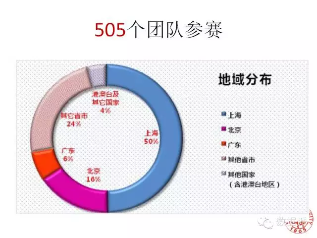 最后來(lái)參賽的隊(duì)伍的數(shù)量超出組織方自己的想象,主辦方開始預(yù)計(jì)有兩百個(gè)團(tuán)隊(duì)就不錯(cuò)了,到方案截止前,組委會(huì)跟評(píng)委們說(shuō),不得了,我們?cè)u(píng)委要很辛苦了,一共有五百多個(gè)方案交上來(lái)。一半是上海的,還有一半是來(lái)自上海以外,北京16%,廣東6%,其他省4%,還有國(guó)外的團(tuán)隊(duì)。在世界上,一個(gè)城市一下子開放這么大的數(shù)據(jù)集也是很轟動(dòng)的事情,所以很多都過(guò)來(lái)參加這個(gè)比賽。最后選出了一百個(gè)方案進(jìn)入復(fù)賽。