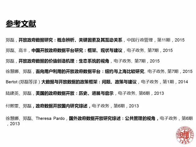 我們實(shí)驗(yàn)室從2011年開始關(guān)注和研究開放數(shù)據(jù),2013年開始發(fā)表開放數(shù)據(jù)方面的論文,上個(gè)月剛在中國(guó)行政管理也發(fā)了一篇。今天由于時(shí)間關(guān)系,還沒有講透的地方,大家可以參考這些論文。謝謝大家!